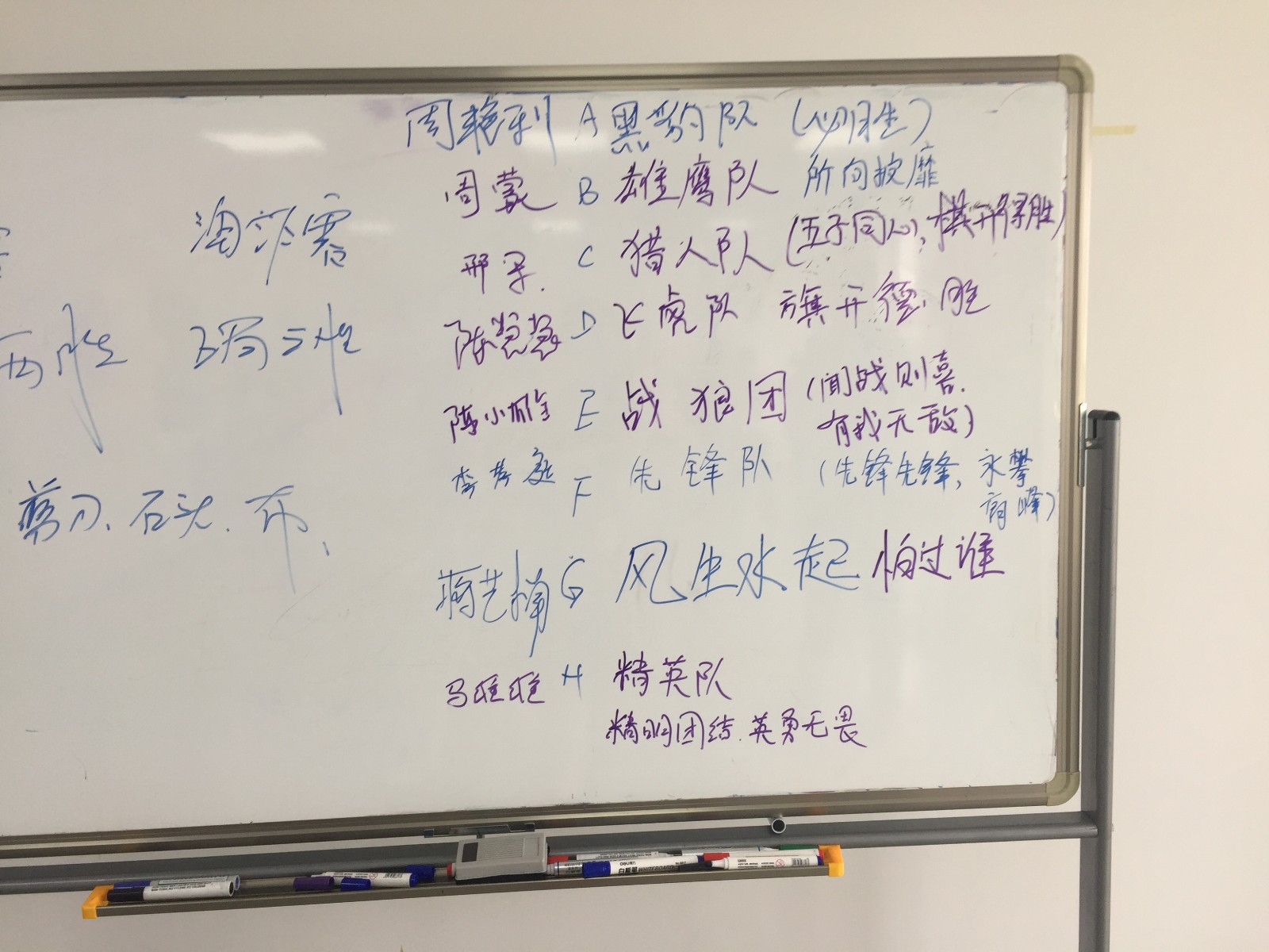 先来看看我们今天参赛的队伍和他们的队名吧!有黑豹、雄鹰、猎人、飞虎……等的八个小分队,每个小队的队名都”战斗力”十足呀!看大家都很兴奋,个个都跃跃欲试,那我们就赶紧开始吧!